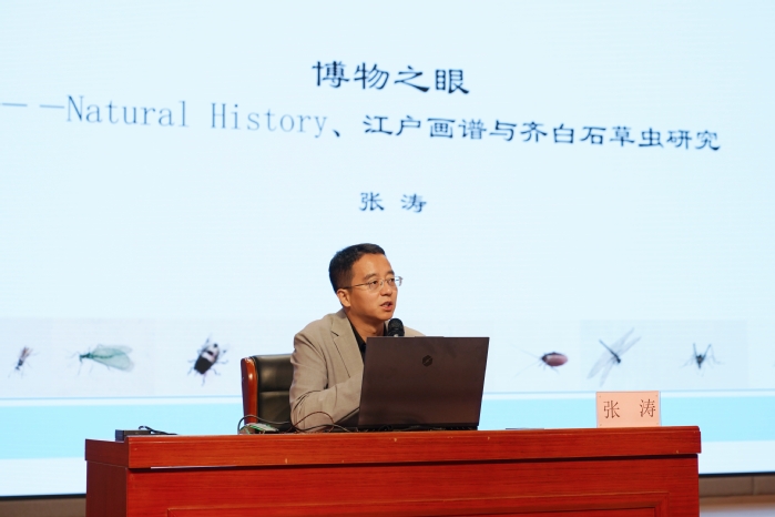讲座上,张涛首先概述了齐白石的艺术人生。他指出,齐白石以农民出身而至职业画家、艺专教授,再到人民艺术家,其艺术成就堪称传奇。在一个动荡不安的大时代背景下,齐白石用他充满温情的画笔,描绘出充满生机的一草一木、虾蟹鱼虫,从而写下了自己的艺术故事。随后,张涛详细探讨了齐白石走上职业化之路的过程、艺术风格的塑成,通过具体的艺术作品画作实例,深入剖析了齐白石的艺术特色和创作手法。他强调,齐白石的艺术风格独特而鲜明,其画作不仅具有极高的艺术价值,更蕴含着深厚的文化底蕴。