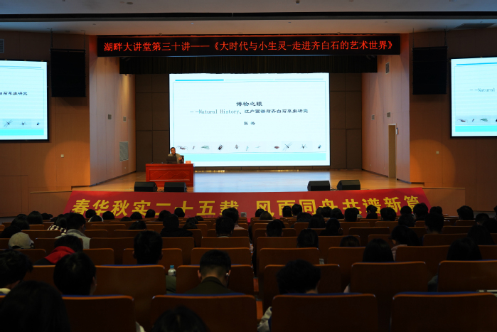12月2日,湖畔大讲堂第三十讲《大时代与小生灵—走进齐白石的艺术世界》在我院图书馆报告厅举行。本期湖畔大讲堂由中央美术学院副教授、硕士研究生导师张涛担任主讲嘉宾,特邀中国美术家协会会员、浙江省美术家协会理事周燕和知名策展人王蓓莅临现场,学院党委书记王艳,副院长郑皓,纪委书记张馨艺,文理学院党总支书记张朝霞,文理学院执行院长李承家出席本次讲座,讲座由周燕主持。