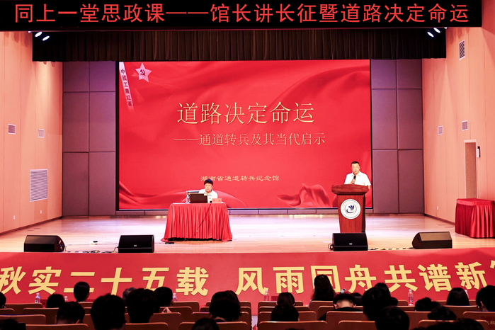 郑湘寄语在场师生,历史照亮着未来,走好新时代长征路需牢记初心使命,不忘来时路,深知道路来之不易;坚定道路自信,走稳当下路,明晰道路问题是决定成败的首要问题;弘扬通道转兵精神,走好未来路,以史为鉴、开创未来,在强国建设、民族复兴新征程上书写时代新篇。